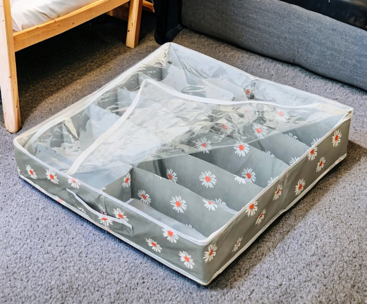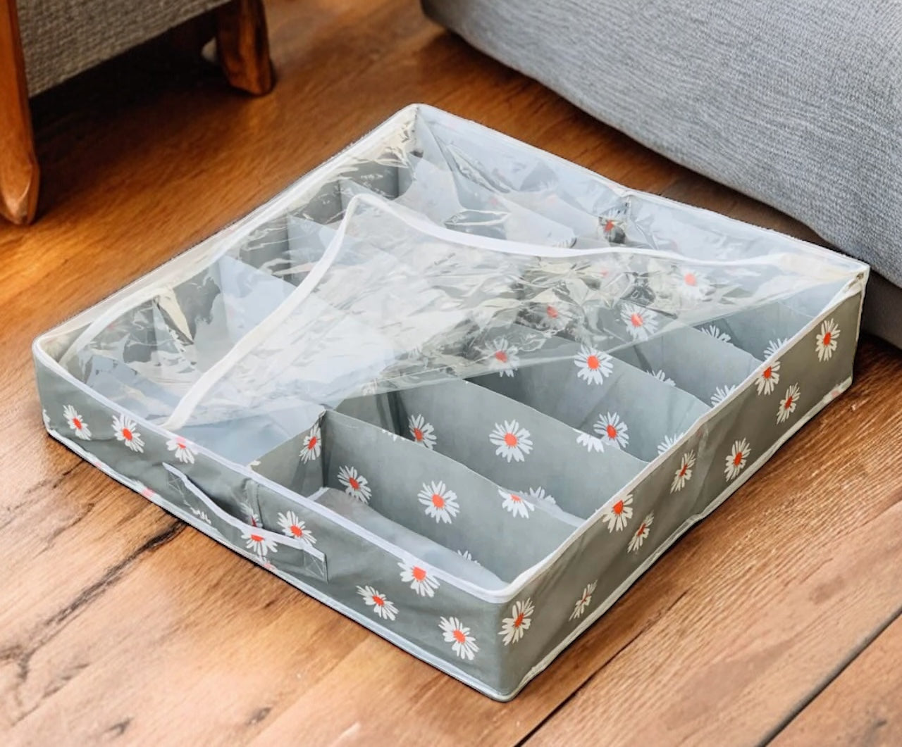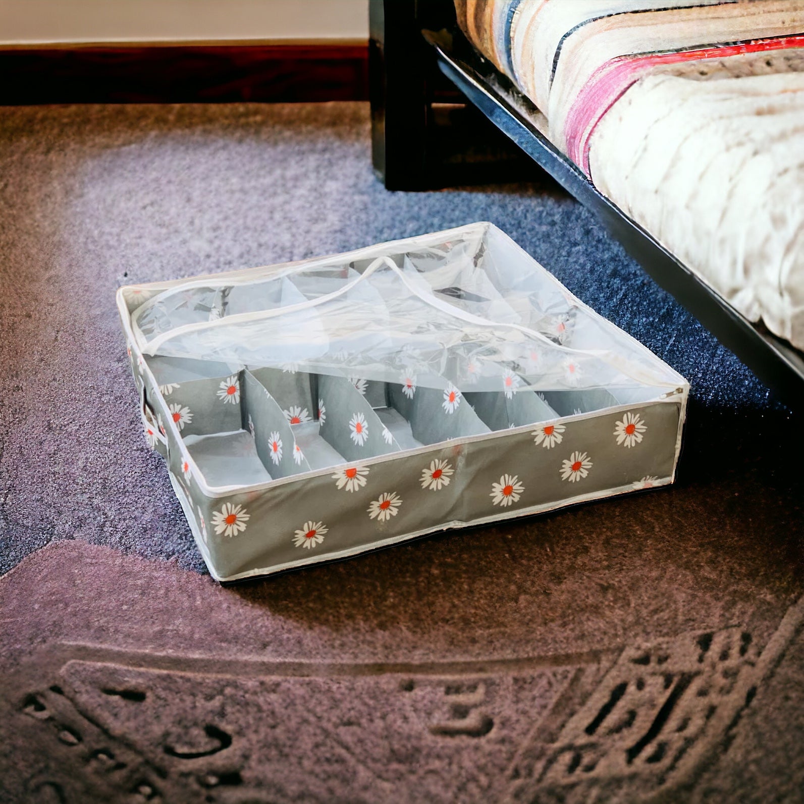 The box has 12 compartments that can hold up to 12 pairs of shoes at the same time Made of non-woven fabric and transparent PVC, it is durable and practical Use these shoes and store them away from dust and moisture It is folding, it can be fold when it's not in use, it doesn't take up space Zipper open and close design, easy to take out and store shoes
