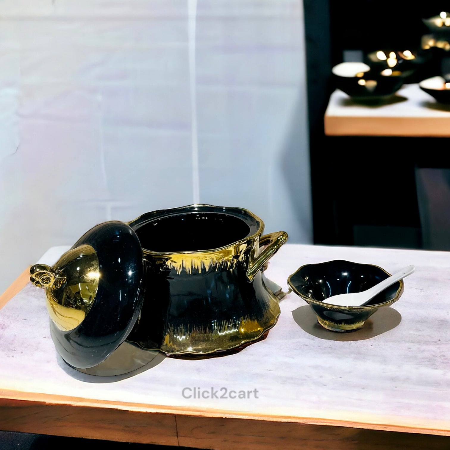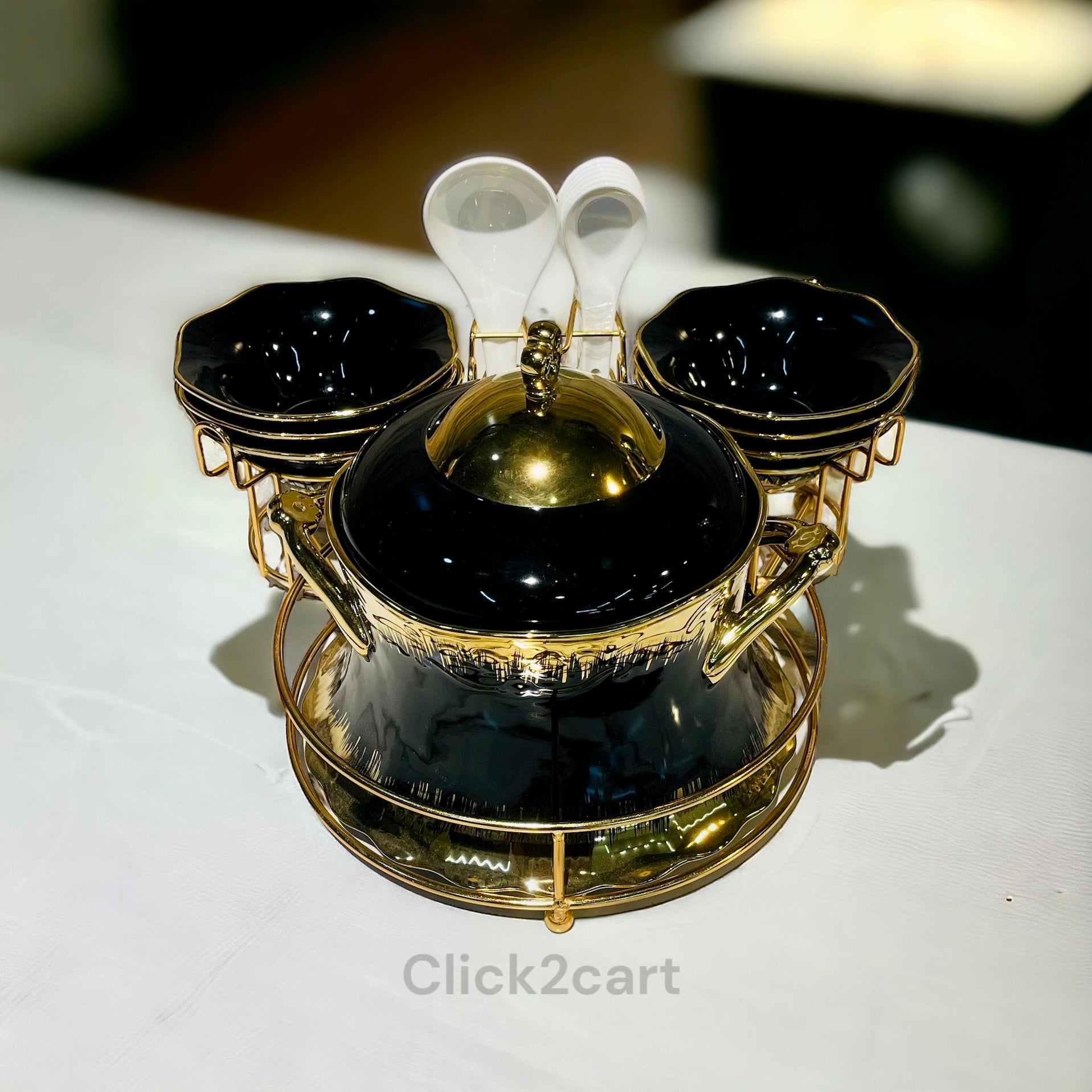 Elevate your dining experience with our Black & Gold 6 Person Serving Soup Set. Crafted with elegance, this set adds a touch of sophistication to any meal. With enough pieces to serve a group of six, you can impress your guests while enjoying your favorite soups.