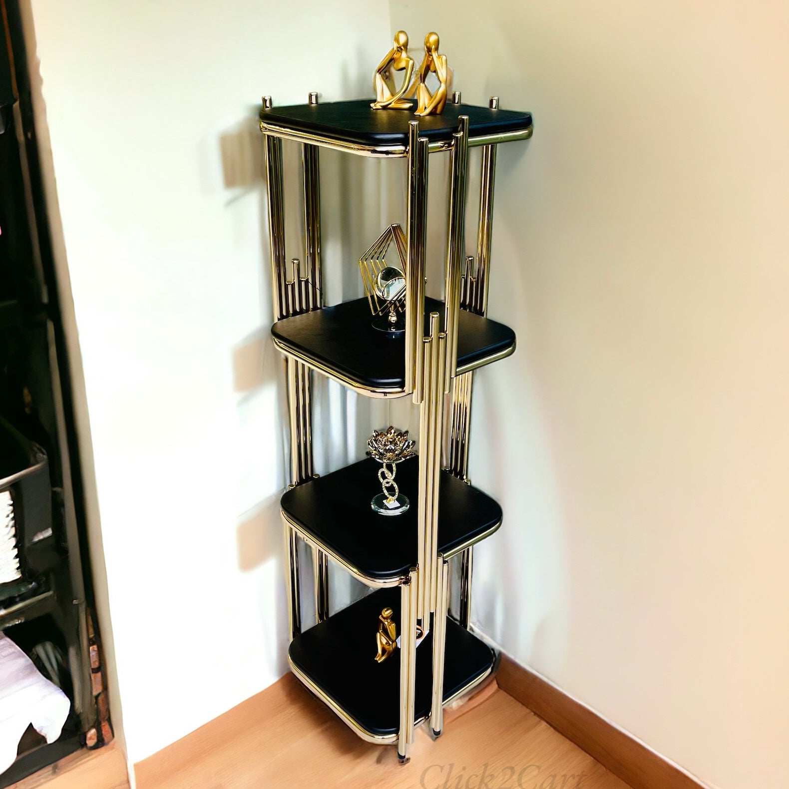Maximize your storage space with our Golden & Black Corner Rack. With its unique design, this rack fits perfectly in any corner, making use of otherwise wasted space. Crafted with a golden and black finish, it adds a touch of elegance to any room. Elevate your organization game today!