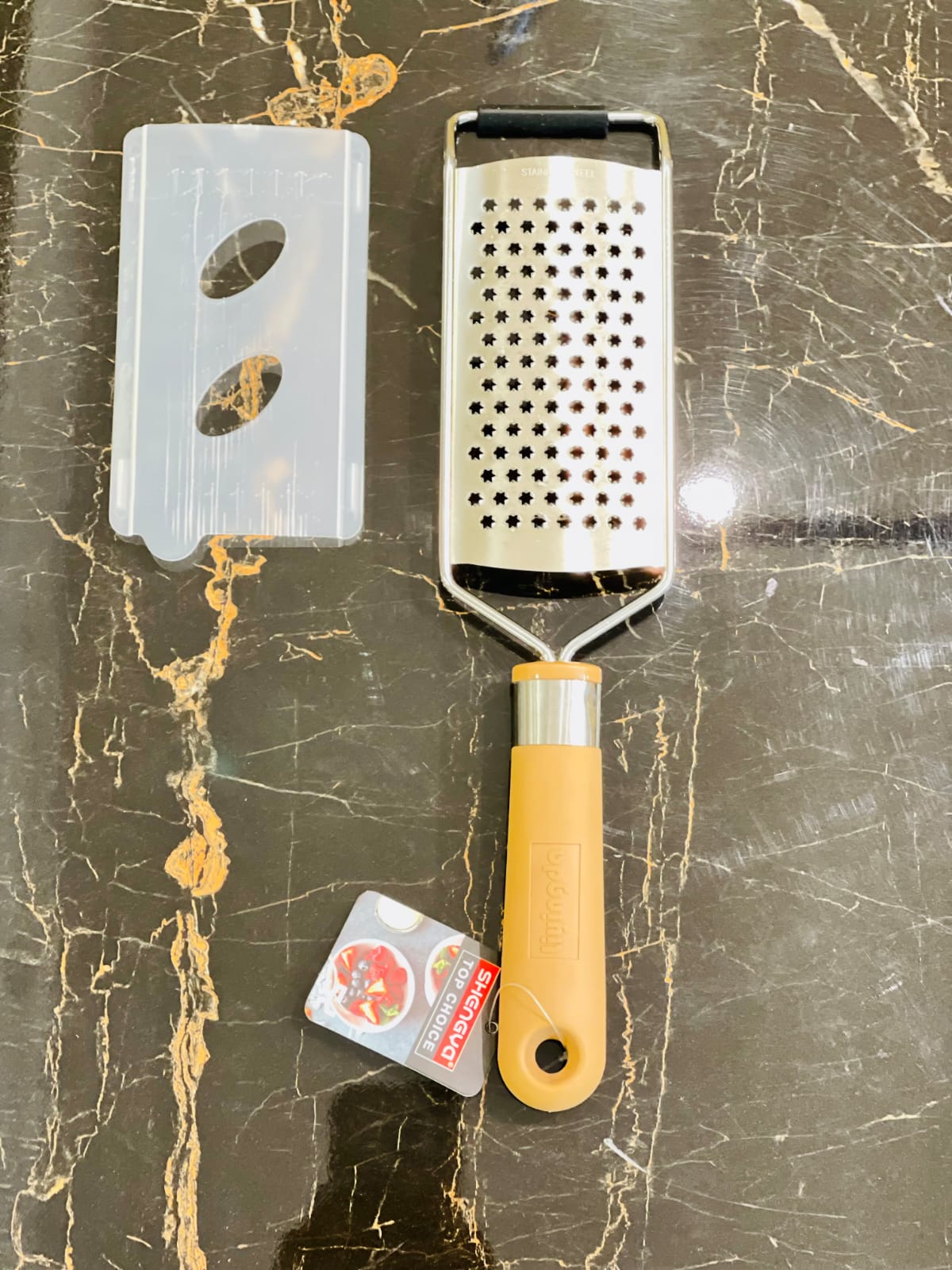 This Shingya stainless Grater is the perfect tool for grating, shredding, and slicing. With its stainless-steel construction, it is strong, durable, and resistant to corrosion, ensuring a long lasting product. Its razor-sharp blades make grating easy and efficient. A must-have for any home cook.